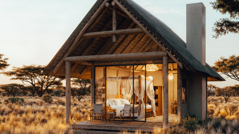 Experience the wild romantic of Namibia with overnight adventure in our small savannah camp. Elevated tents, a small fireplace, a shower with a unique view of the wild – KAMBAKU's bush camp.