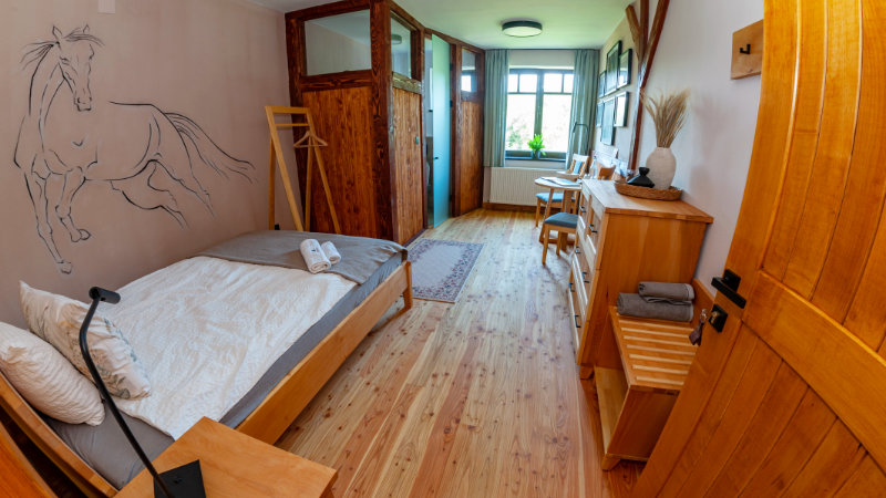 We were welcomed with a glass of sparkling wine and friendly staff who gave us information and a delicious dinner. The room we received was newly renovated and nicely decorated with a wardrobe and seating area. We were served excellent hot meals, mostly flavorful vegetarian dishes. Mineral water, house wine, and beer were included in the price. Varied riding with the perfect amount of canter and trot. The horses were very good and lively. It was a fantastic experience!