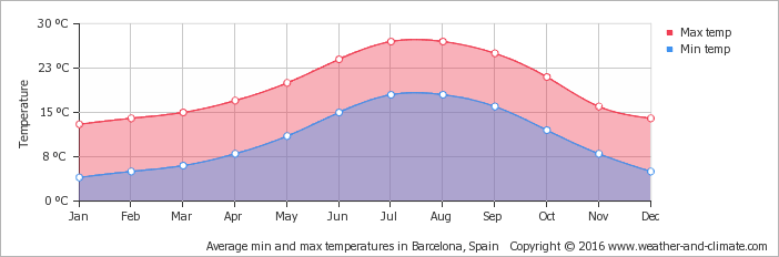 From April to end of October, it is normally more than 25 degrees during the day. In July-August there may be more than 30 degrees in the shade. Sea water has a temperature of about 25 degrees all the way to the end of October, but is colder in spring. It rarely rains, except during November to February.