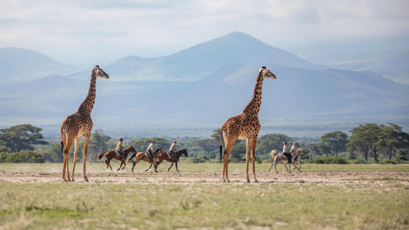 Day 6 - Early wake up calls followed by an English breakfast. Everyone mounts their companion and the safari starts heading towards the so-called Seven Sisters. After have crossed the seven hills (seven sisters) we ride through Sinya Village and continue towards lunch, served under a shady tree. The terrain varies from opened grassland to beautiful canopy forests. The day offers good chance of seeing plains game such as zebras, giraffes and wildebeests but most important is the presence of the shy antelope, the Gerenuk that we will keep an eye for as we ride along. The night is spent at an astonishing place, hopefully the night is clear and you will get the feeling being watched by four powerful mountains, Mt Meru, Namanga, Longido and the most legendary of all, Mt Kilimanjaro.
